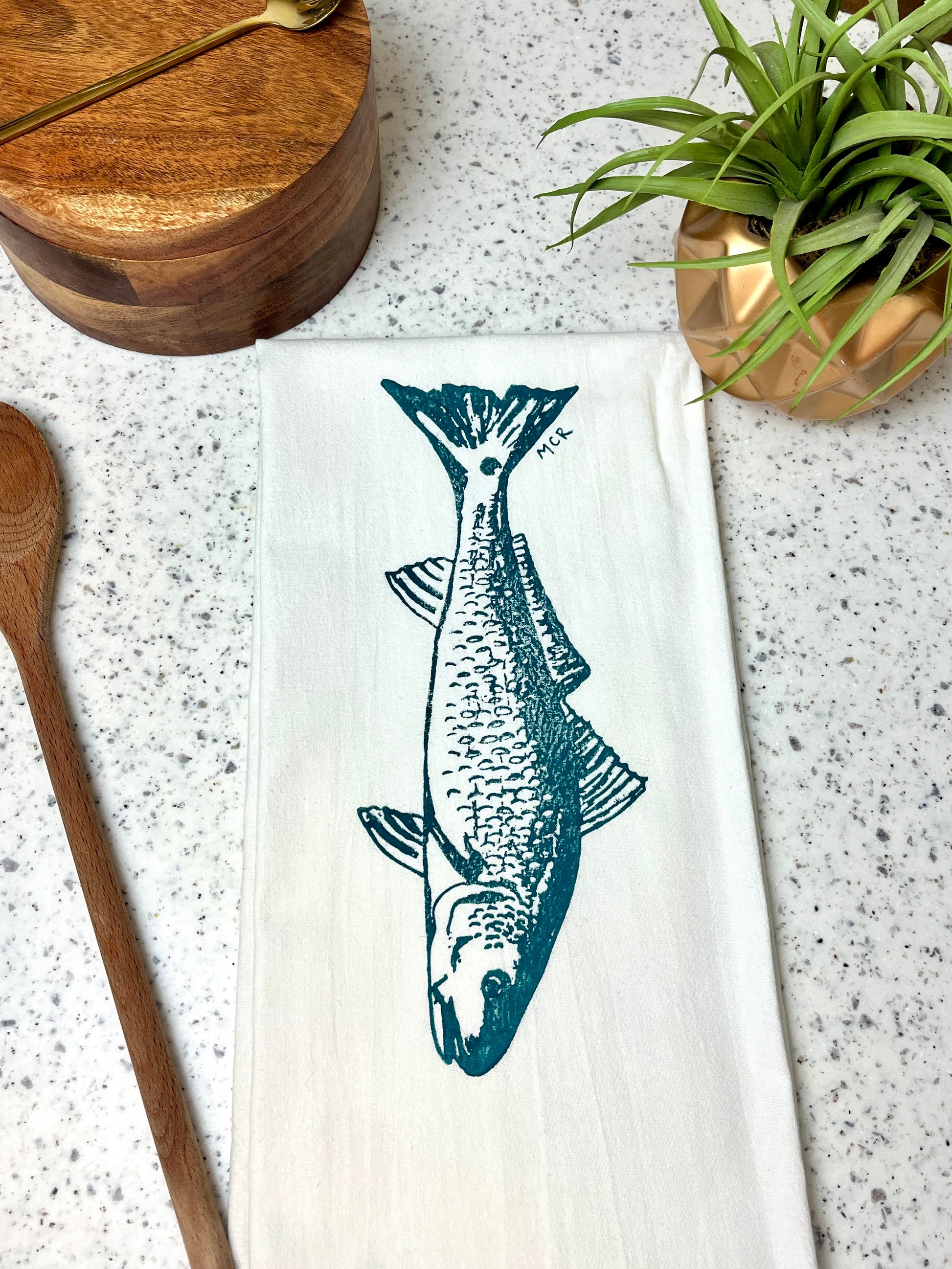 Bring a touch of the coast into your kitchen with my Fish tea towels! Each design is pressed by hand using my own Spottail Bass drawing stamp—no two are exactly alike, making each towel a small work of art.